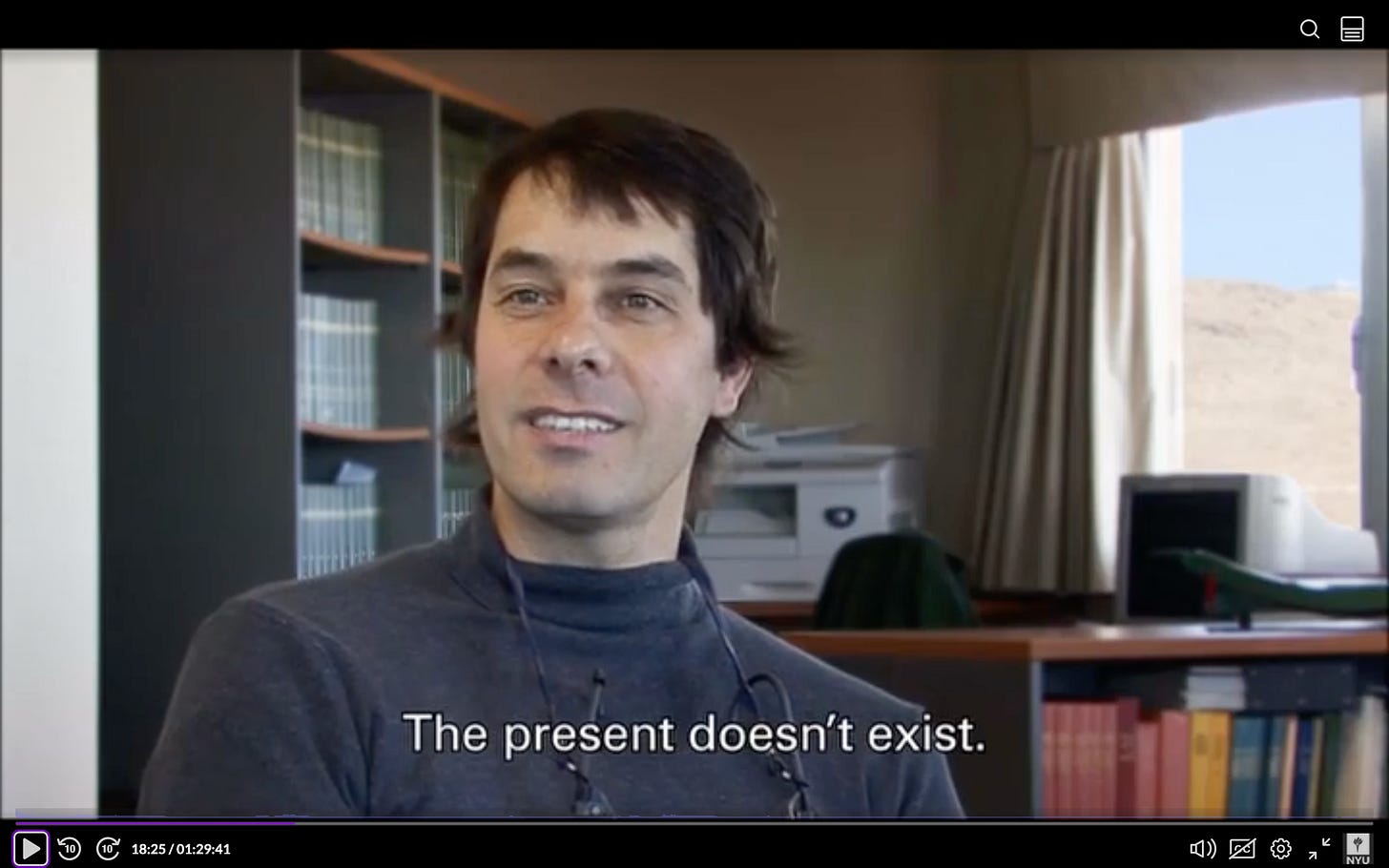 He points at the camera we can’t see, says that its standing a few meters away from him means that this conversation is already in the past, that we don’t recognize anything in the instant that we look at it, how the trap is to think otherwise, since any signal takes time to travel and to be answered. Yet the upside of this lag tells us that the power to reflect is made room for by our experience of each moment-to-moment. And that room should be taken.